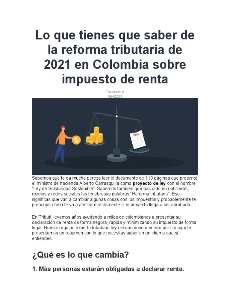 Con la fuerte presión ejercida por los colombianos, el gobierno del presidente duque se vio obligado a retirar el proyecto que presentó con el nombre de " Este documento propone una reforma tributaria comprensiva tendiente a: La incertidumbre fiscal generada por el retiro de la reforma tributaria disparo el dolar from img.lalr.co resumen de la reforma tributaria de 2021 en colombia. Se eliminan 45 bienes que actualmente no causan iva: resumen este documento pretende apoyar la discusión acerca de la reforma tributaria que requiere el país para enfrentar con mayor solvencia los retos políticos y económicos que le impone el entorno nacional e internacional.